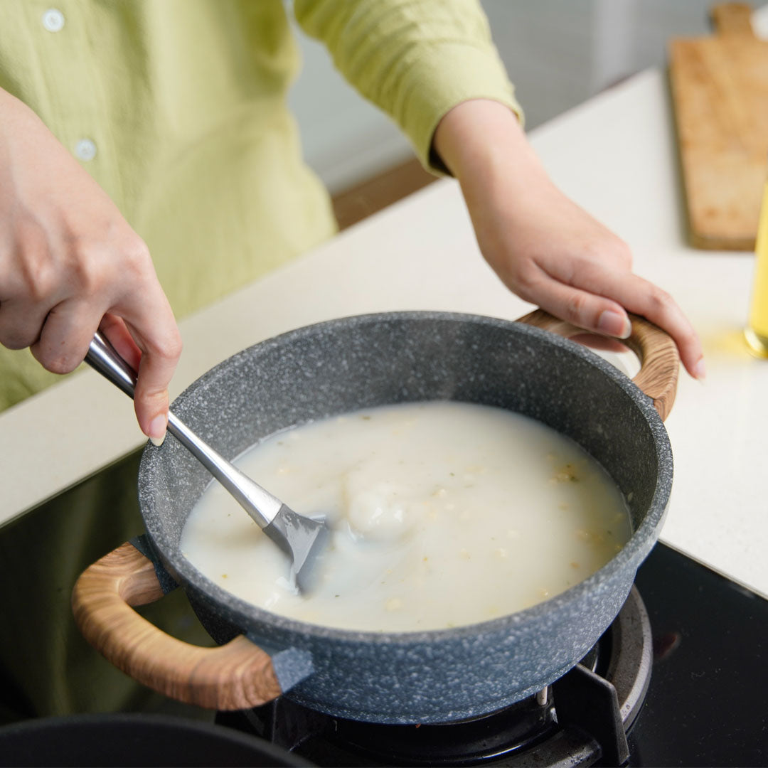 Desain Elegan dan Ergonomis: Panci ini memiliki tampilan yang mewah dengan warna corak granit alami dan gagang berlapis sintetis bercorak kayu yang nyaman digenggam serta tahan panas, pastinya akan menambah estetika dapur Anda.