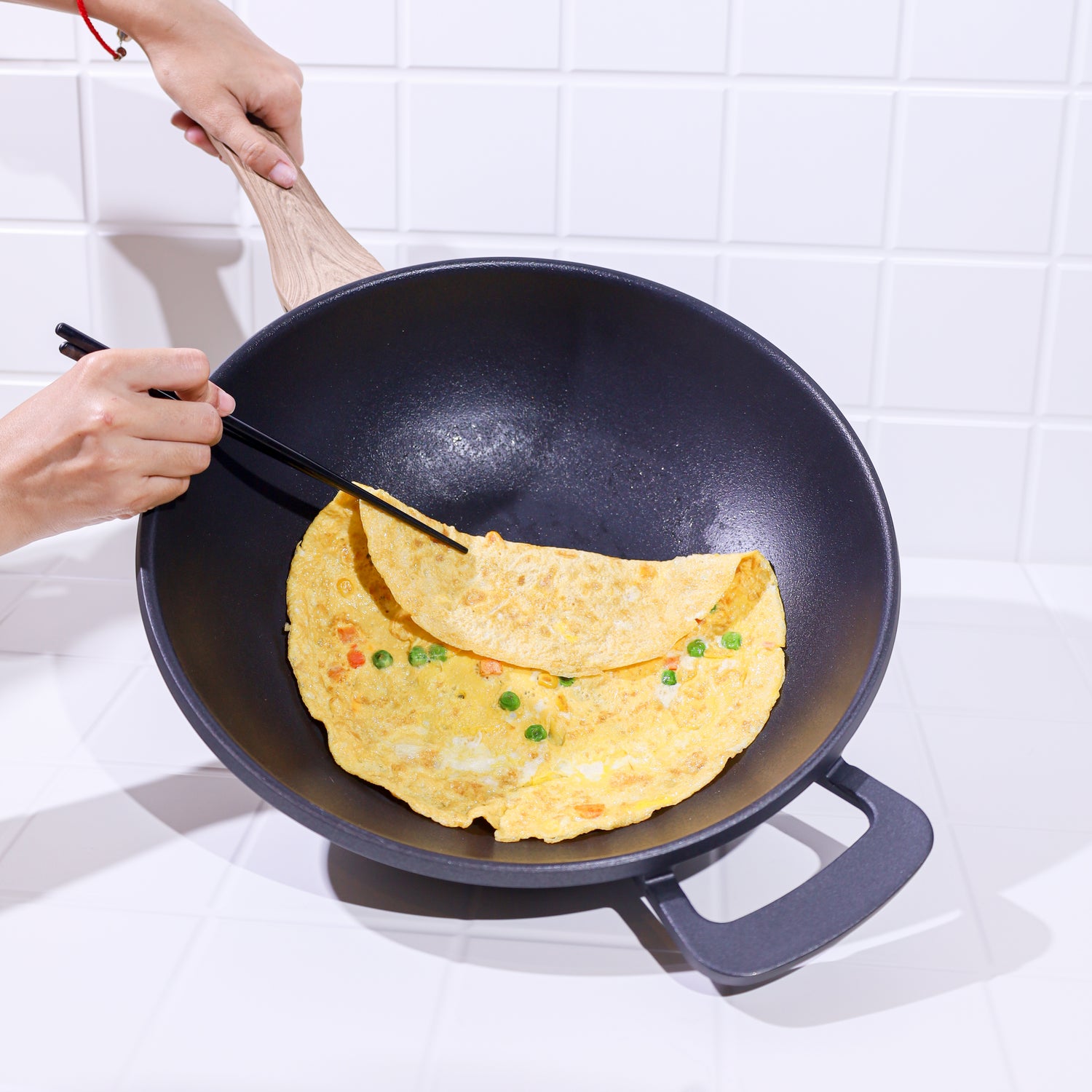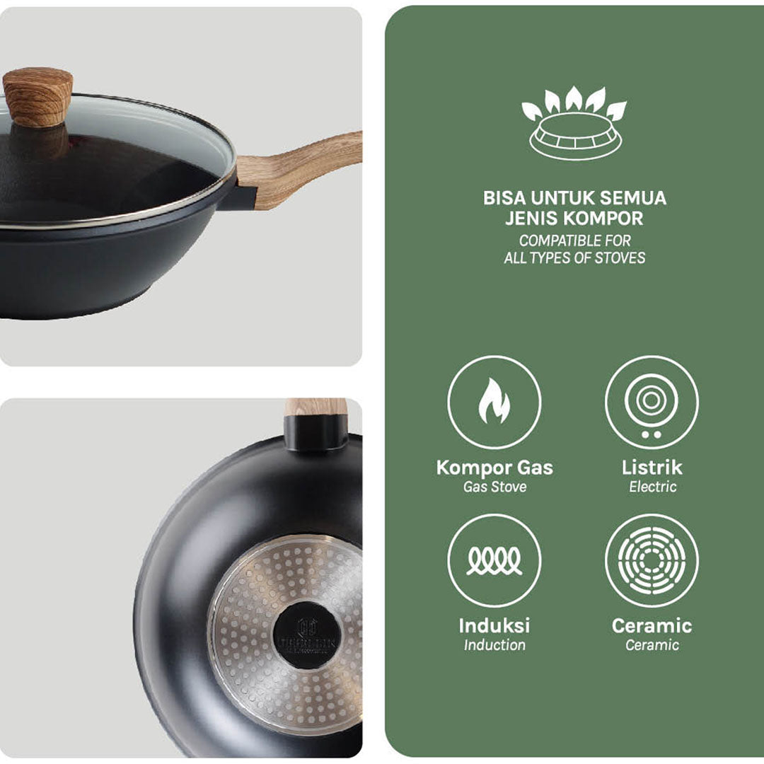Desain Elegan dan Ergonomis: Wajan ini memiliki tampilan yang mewah dengan warna hitam pekat alami dan gagang berlapis sintetis bercorak kayu yang nyaman digenggam serta tahan panas, dan pastinya akan menambah estetika dapur Anda.