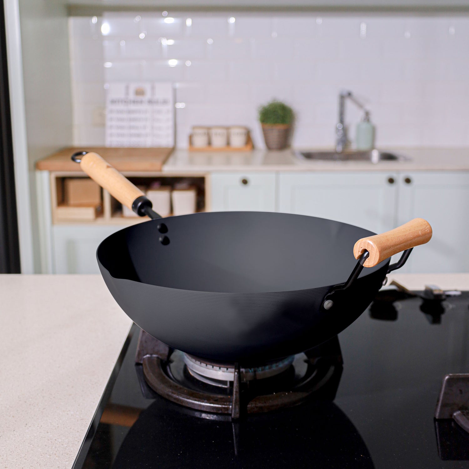 Ringan dan kuat: terbuat dari bahan carbon steel yang dikenal ringan namun memiliki daya tahan yang baik, sangat cocok untuk memasak makanan dengan teknik flipping (melempar bahan di udara sebentar) seperti nasi goreng karena bobotnya yang ringan.