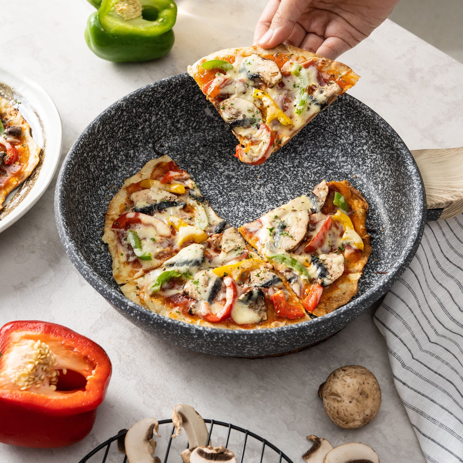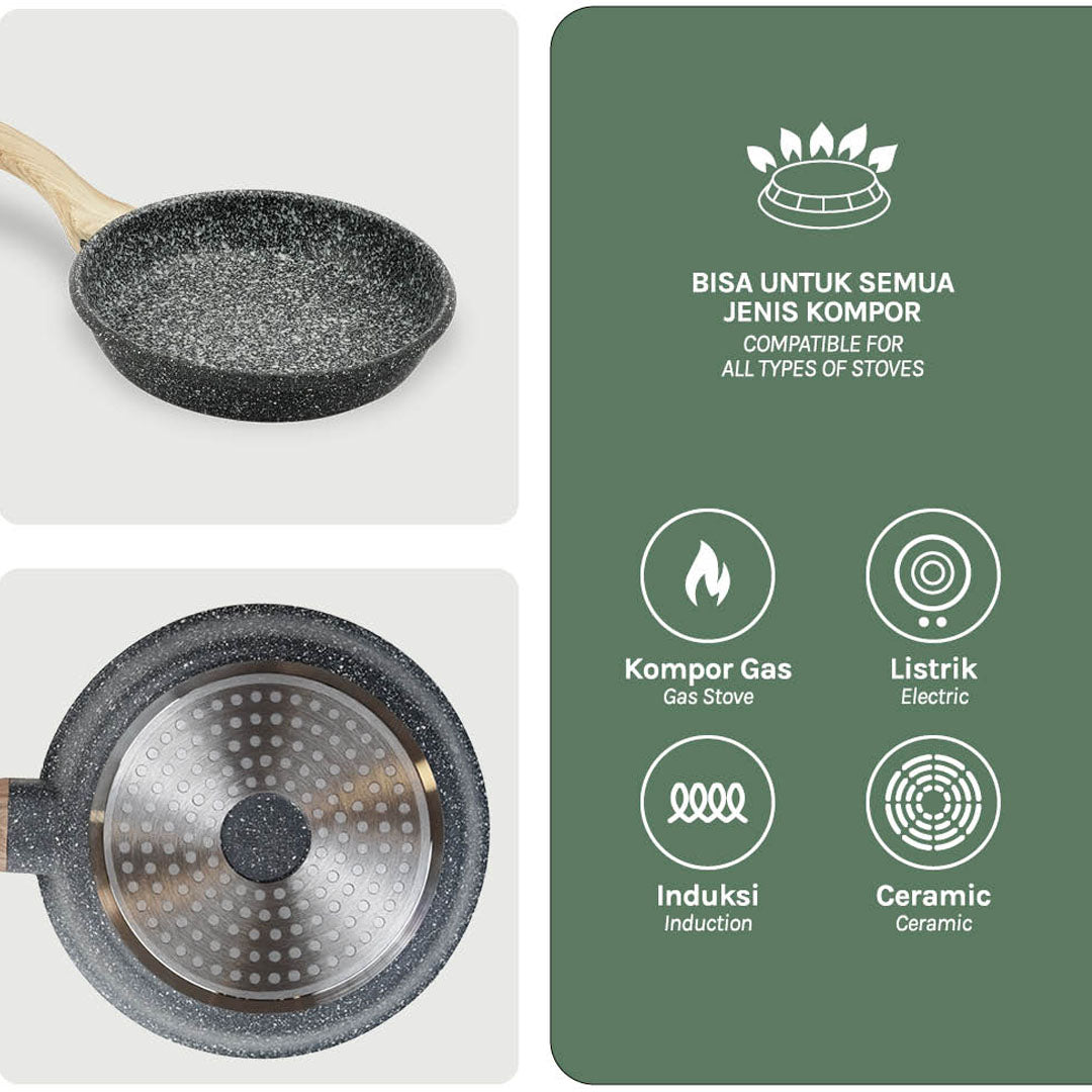 Desain Elegan dan Ergonomis: Fry pan ini memiliki tampilan yang mewah dengan warna corak granit alami dan gagang berlapis sintetis bercorak kayu yang nyaman digenggam serta tahan panas, pastinya akan menambah estetika dapur Anda.