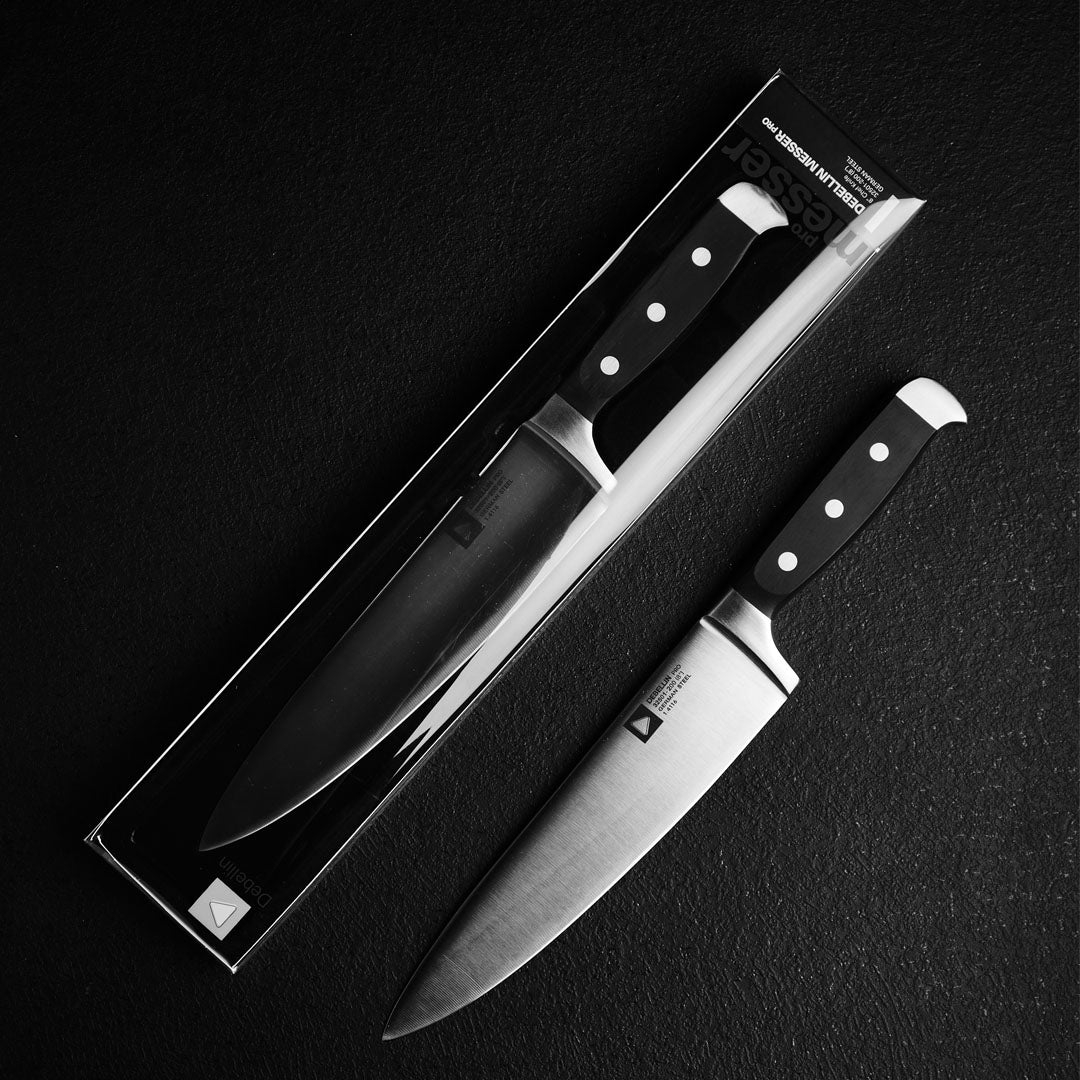 Debellin Messer Pro Chef Knife 8" adalah pisau yang Ideal untuk memotong daging, ikan, dan sayuran, baik untuk irisan tipis maupun potongan yang lebih besar. sehingga Debelliners bisa mendapatkan hasil ketipisan maupun ketebalan yang diinginkan.