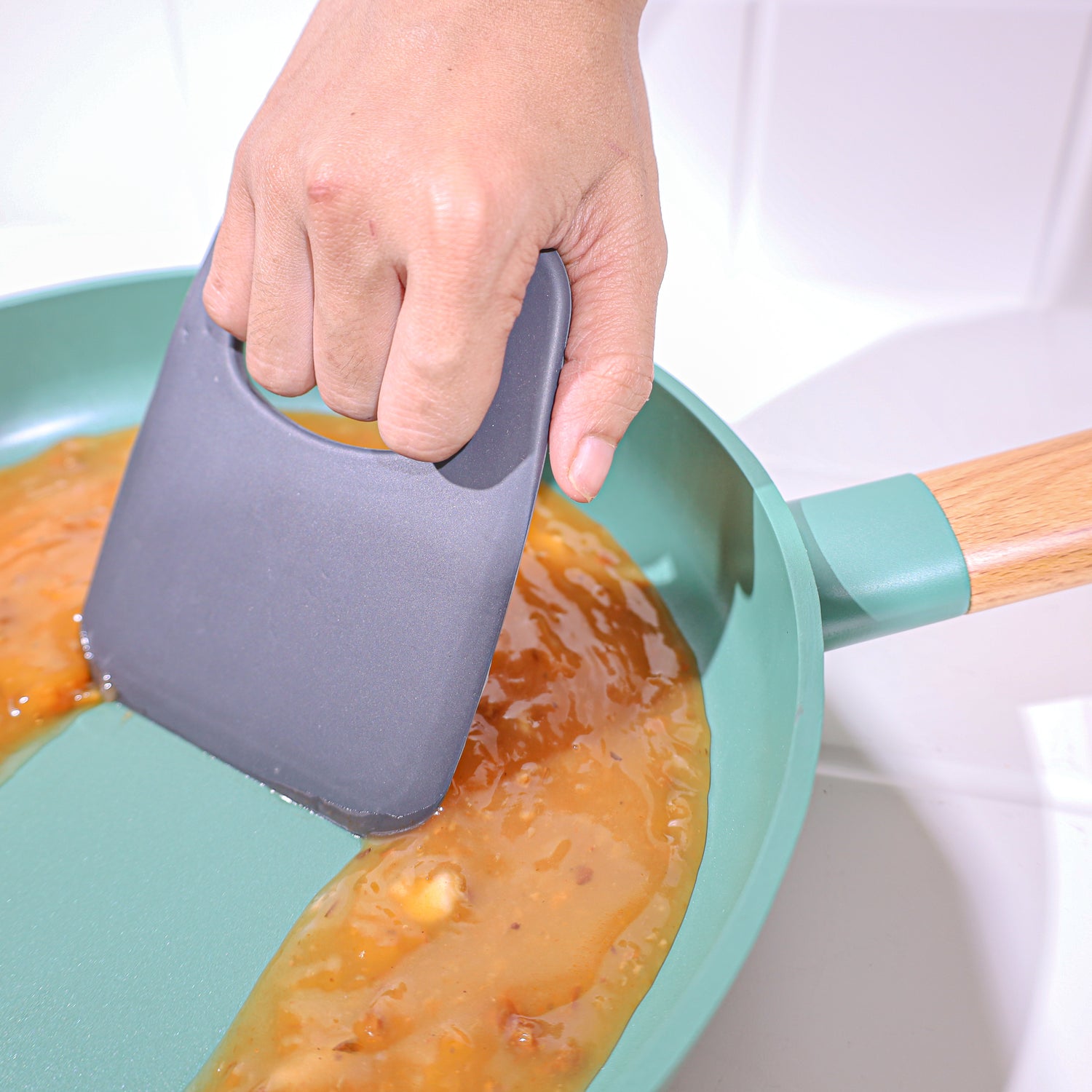 Jika terdapat noda membandel atau sisa makanan yang sulit dibersihkan, rendam scraper silikon dalam air hangat dengan sabun selama beberapa menit sebelum mencuci.